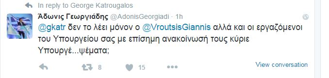 Στον Γιώργο Κατρούγκαλο απάντησε ο Άδωνις Γεωργιάδης ο οποίος του έγραψε: “Δεν το λέει μόνον ο Γιάννης Βρούτσης αλλά και οι εργαζόμενοι του Υπουργείου σας με επίσημη ανακοίνωσή τους κύριε Υπουργέ…ψέματα;”