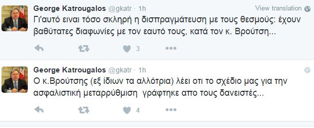“Ο κ.Βρούτσης (εξ ίδιων τα αλλότρια) λέει οτι το σχέδιο μας για την ασφαλιστική μεταρρύθμιση γράφτηκε απο τους δανειστές… Γι’αυτό ειναι τόσο σκληρή η δισπραγμάτευση με τους θεσμούς: έχουν βαθύτατες διαφωνίες με τον εαυτό τους, κατά τον κ. Βρούτση…” έγραψε ο υπουργός Εργασίας στο Twitter.