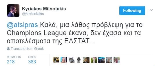 Με τρολάρισμα απάντησε και ο πρόεδρος της Νέας Δημοκρατίας στο tweet του πρωθυπουργού Αλέξη Τσίπρα ο οποίος τον πείραξε με αφορμή τη νίκη-πρόκριση της Μπαρτσελόνα. Ο πρόεδρος της ΝΔ έγραψε στον προσωπικό λογαριασμό του στο twitter: