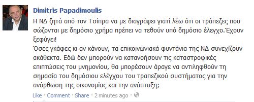 “Η ΝΔ ζητά από τον Τσίπρα να με διαγράψει γιατί λέω ότι οι Τράπεζες που σώζονται με δημόσιο χρήμα, πρέπει να τεθούν υπό δημόσιο έλεγχο. Έχουν ξεφύγει!. Όσες γκάφες και αν κάνουν τα επικοινωνιακά φυντάνια της ΝΔ συνεχίζουν ακάθεκτα. Εδώ δεν μπορούν να κατανοήσουν τις καταστροφικές επιπτώσεις του μνημονίου, θα μπορέσουν άραγε να αντιληφθούν τη σημασία του δημόσιου ελέγχου του τραπεζικού συστήματος για την ανόρθωση της οικονομίας και την ανάπτυξη;”, έγραψε ο Δημήτρης Παπαδημούλης στο Facebook.