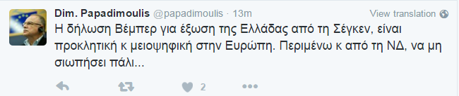 Τη δήλωση του αρχηγού της Κ.Ο του Ευρωπαϊκού Λαϊκού Κόμματος στο Ευρωκοινοβούλιο, Μάνφρεντ Βέμπερ για προσωρινή έξοδο της Ελλάδας από τον χώρο της Σένγκεν, σχολιάζει ο αντιπρόεδρος του ευρωπαϊκού κοινοβουλίου και ευρωβουλευτής του ΣΥΡΙΖΑ, Δημήτρης Παπαδημούλης, με ανάρτηση του στο Twitter, κάνοντας λόγο για μία προκλητική δήλωση, ενώ καλεί την Νέα Δημοκρατία να μην σιωπήσει.