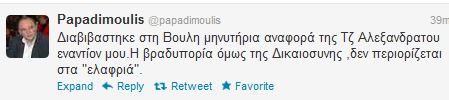 Ο βουλευτής του ΣΥΡΙΖΑ, Δημήτρης Παπαδημούλης, απαντά, μέσω twitter, στη μήνυση που κατατέθηκε εναντίον του από την Τζούλια Αλεξανδράτου, για συκοφαντική δυσφήμιση, η οποία διαβιβάστηκε στη Βουλή από τον Άρειο Πάγο.