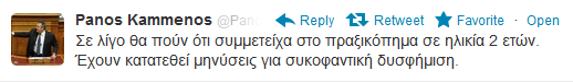 “Σε λίγο θα πουν ότι συμμετείχα στο πραξικόπημα σε ηλικία 2 ετών” γράφει ο Πάνος Καμμένος στο twitter ως απάντηση στο δημοσίευμα για το το εξώδικο που κατέθεσε εναντίον του ο υφυπουργός της δικτατορίας, Γεώργιος Γεωργαλάς.”Έχουν κατατεθεί μηνύσεις για συκοφαντική δυσφήμιση” διευκρινίζει ο πρόεδρος των Ανεξάρτητων Ελλήνων.