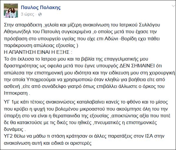 Με ανάρτησή του στο Facebook ο Παύλος Πολάκης απάντησε στην ανακοίνωση του Ιατρικού Συλλόγου Αθηνών, στην οποία θέτει θέμα νομιμότητας για την παρουσία του αναπληρωτή υπουργού Υγείας σε επέμβαση στο νοσοκομείο της Σαντορίνης.