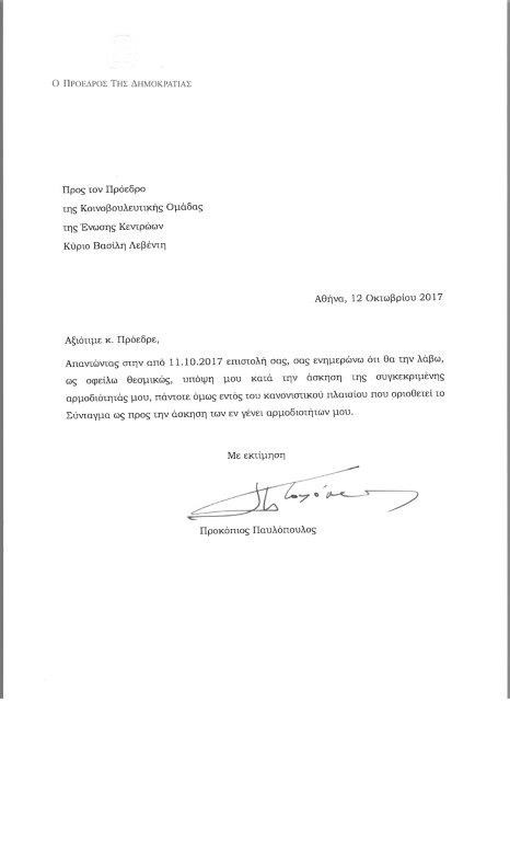 Απάντηση στον Βασίλη Λεβέντη έδωσε με επιστολή του ο Προκόπης Παυλόπουλος.Ο Πρόεδρος της Δημοκρατίας, αναφέρει ότι θα λάβει υπόψη του την επιστολή του Προέδρου της Ένωσης Κεντρώων, με την οποία ο Βασίλης Λεβέντης ζητά από τον κ. Παυλόπουλο να μην υπογράψει τον νόμο για την αλλαγή ταυτότητας φύλου, πάντοτε όμως όπως λέει “εντός του κανονιστικού πλαισίου που οριοθετεί το Σύνταγμα”.Αναλυτικά η απάντηση του Προέδρου της Δημοκρατίας:“Απαντώντας στην από 11.10.2017 επιστολή σας, σας ενημερώνω ότι θα την λάβω, ως οφείλω θεσμικώς, υπόψη μου κατά την άσκηση της συγκεκριμένης αρμοδιότητάς μου, πάντοτε όμως εντός του κανονιστικού πλαισίου που οριοθετεί το Σύνταγμα ως προς την άσκηση των εν γένει αρμοδιοτήτων μου”.