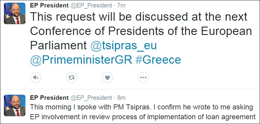 Όπως έγραψε ο κ. Σουλτς στο twitter «το αίτημα θα συζητηθεί στην επόμενη διάσκεψη των Προέδρων του Ευρωπαϊκού Κοινοβουλίου».
