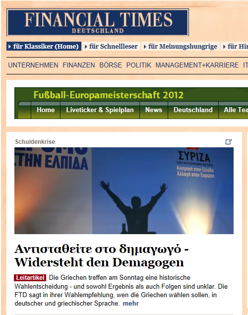 Η ανακοίνωση-απάντηση του γραφείου Τύπου του ΣΥΡΙΖΑ, για το δημοίευμα της γερμανικής έκδοσης των Financial Times:”Η χωρίς προηγούμενο ωμή παρέμβαση της γερμανικής έκδοσης των FT αποτελεί πράξη προσβολής της εθνικής αξιοπρέπειας και υπονόμευσης της δημοκρατίας στη χώρα μας.Αν νομίζει το γερμανικό κατεστημένο και οι εγχώριοι σύμμαχοί του, που όλες αυτές τις μέρες απειλούν εργαζόμενους σε επιχειρήσεις, σπέρνουν με εγκληματικά ανεύθυνο τρόπο τον τρόμο της επιστροφής στη δραχμή, ότι θα κάμψουν το φρόνημα του ελληνικού λαού, είναι γελασμένοι.Ο αγώνας για εθνική αξιοπρέπεια, δημοκρατία, κοινωνική δικαιοσύνη, ο αγώνας κατά της διαφθοράς και της διαπλοκής θα νικήσει το φόβο και την υποταγή.Να χαίρονται ο κ. Σαμαράς και ο κ. Βενιζέλος τους προστάτες τους.” Για να δείτε το δημοσίευμα των Financial Times πατήστε εδώ