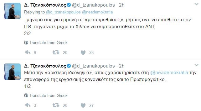 «Μετά την “αριστερή ιδεοληψία”, όπως χαρακτηρίσατε στη @neademokratia, την επαναφορά της εργασιακής κανονικότητας και το Πρωτομαγιάτικο μήνυμά σας για εμμονή σε “μεταρρυθμίσεις”, μήπως αντί να επιτίθεστε στον πρωθυπουργό, πηγαίνατε μέχρι το Χίλτον να συμπαρασταθείτε στο ΔΝΤ;», γράφει στο twitter, ο υπουργός Επικρατείας και κυβερνητικός εκπρόσωπος Δημήτρης Τζανακόπουλος, απαντώντας σε σχόλιο της ΝΔ για το μήνυμα του πρωθυπουργού για την εργατική Πρωτομαγιά.