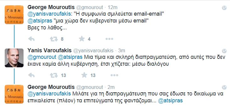 Συνομιλία μέσω twitter είχαν ο υπουργός Οικονομικών, Γιάνης Βαρουφάκης και ο διευθυντής του γραφείου Τύπου του Αντώνη Σαμαρά, Γιώργος Μουρούτης.