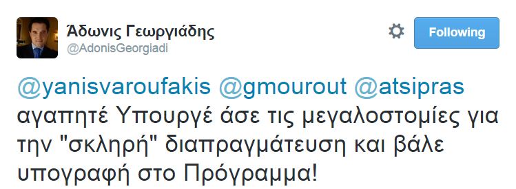 Στο διάλογο παρενέβη και ο βουλευτής της Νέας Δημοκρατίας, Άδωνις Γεωργιάδης, ο οποίος σχολίασε: «Αγαπητέ Υπουργέ άσε τις μεγαλοστομίες για την “σκληρή” διαπραγμάτευση και βάλε υπογραφή στο Πρόγραμμα!».