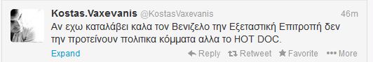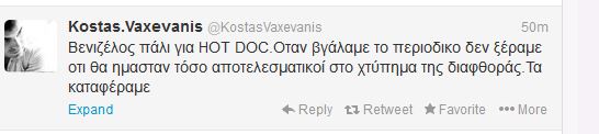 Ο Κώστας Βαξεβάνης σχολίασε τα όσα είπε ο Ευάγγελος Βενιζέλος για εκείνον στην ομιλία του μέσω Twitter.
