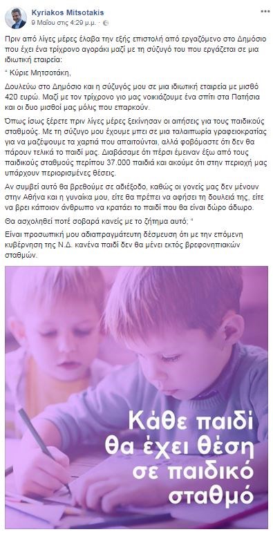 Η καμπάνια του κ. Μητσοτάκη για τους παιδικούς σταθμούς είναι εξαιρετική, τον προδίδει όμως το παρελθόν του. Στη διάρκεια της κυβέρνησης στην οποία συμμετείχε, έμειναν εκτός χιλιάδες παιδιά.