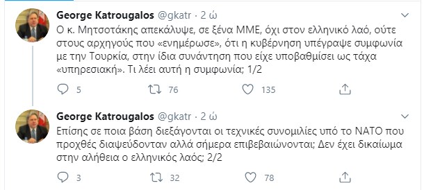 «Ο κ. Μητσοτάκης απεκάλυψε σε ξένα ΜΜΕ, όχι στον ελληνικό λαό, ούτε στους αρχηγούς που “ενημέρωσε”, ότι η κυβέρνηση υπέγραψε συμφωνία με την Τουρκία, στην ίδια συνάντηση που είχε υποβαθμίσει ως τάχα “υπηρεσιακή”. Τι λέει αυτή η συμφωνία;» αναφέρει ο τομεάρχης Εξωτερικών του ΣΥΡΙΖΑ, Γιώργος Κατρούγκαλος, σε ανάρτηση του στο Twitter. Επιπλέον, θέτει το ερώτημα «σε ποια βάση διεξάγονται οι τεχνικές συνομιλίες υπό το ΝΑΤΟ που προχθές διαψεύδονταν, αλλά σήμερα επιβεβαιώνονται; Δεν έχει δικαίωμα στην αλήθεια ο ελληνικός λαός;».