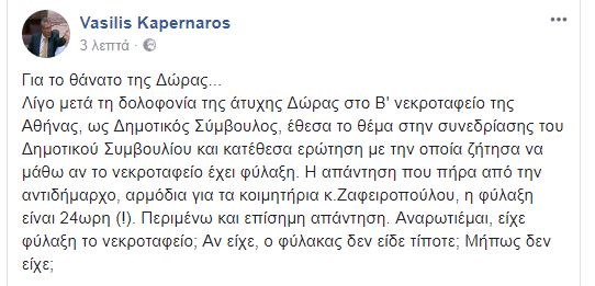 “Λίγο μετά τη δολοφονία της άτυχης Δώρας στο Β’ νεκροταφείο της Αθήνας, ως Δημοτικός Σύμβουλος, έθεσα το θέμα στη συνεδρίαση του Δημοτικού Συμβουλίου και κατέθεσα ερώτηση με την οποία ζήτησα να μάθω αν το νεκροταφείο έχει φύλαξη. Η απάντηση που πήρα από την αντιδήμαρχο, αρμόδια για τα κοιμητήρια κ.Ζαφειροπούλου, η φύλαξη είναι 24ωρη (!). Περιμένω και επίσημη απάντηση. Αναρωτιέμαι, είχε φύλαξη το νεκροταφείο; Αν είχε, ο φύλακας δεν είδε τίποτε; Μήπως δεν είχε; ” έγραψε ο δημοτικός σύμβουλος και γνωστός ποινικολόγος στο Facebook.