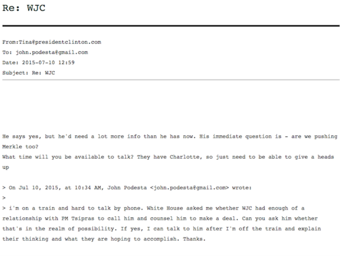 «Είμαι στο τρένο και είναι δύσκολο να μιλήσω στο τηλέφωνο. Ο Λευκός Οίκος ρωτά να μάθει εάν ο Μπιλ Κλίντον έχει αρκετή άνεση με τον Ελληνα πρωθυπουργό Αλέξη Τσίπρα ώστε να του τηλεφωνήσει και να του ζητήσει να πάει σε συμφωνία. Μπορείτε να τον ρωτήσετε εάν υπάρχει αυτή η πιθανότητα; Εάν ναι, μπορώ να του μιλήσω αφού αποβιβαστώ από το τρένο και να του εξηγήσω το σκεπτικό και τον στόχο. Ευχαριστώ», έγραφε στο email του προς τον Μπιλ Κλίντον ο Ποντέστα.