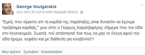 “Εμείς που είμαστε απ τη καρδιά της παράταξης, είναι δυνατόν να έχουμε πρόβλημα καρδιάς;” μου είπε ο Γιώργος Καρατζαφέρης σήμερα που τον είδα στο Νοσοκομείο. Σωστά, τού απάντησα! Και πως να μην το έλεγα,αφού τον είδα ήρεμο, κεφάτο και με διάθεση για κουβέντα!” έγραψε χαρακτηριστικά ο πρώην υπουργός.