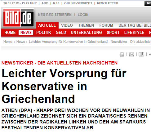 “Μικρό προβάδισμα για τη συντηρητική Νέα Δημοκρατία” είναι ο τίτλος δημοσιεύματος της γερμανικής εφημερίδας, Bild, η οποία αναφέρει:”Σχεδόν τρεις εβδομάδες πριν από τις επικείμενες εκλογές στην Ελλάδα, διεξάγεται ένας δραματικός αγώνας μεταξύ της ριζοσπαστικής αριστεράς του ΣΥΡΙΖΑ και τη συντηρητική Νέα Δημοκρατία, η οποία προτίθεται να τηρήσει τις δεσμεύσεις όσον αφορά στο πρόγραμμα λιτότητας”.”Σε πρόσφταη δημοσκόπηση η Νέα Δημοκρατία του Αντώνη Σαμαρά, προηγείται του ΣΥΡΙΖΑ κατά μία ποσοστιαία μονάδα περίπου, συγκεντρώνοντας το ποσοστό του 23,4%, ενώ ο ΣΥΡΙΖΑ 22,1%.” γράφει η Bild και συνεχίζει:”Οι σοσιαλιστές του ΠΑΣΟΚ, συγκεντρώνουν ένα 13%, παραμένοντας στην τρίτη θέση. Προς το παρόν πάντως, καμία παράταξη δεν φαίνεται να έχει τη δυνατότητα να σχηματίσει αυτοδύναμη κυβέρνηση” κλείνει το δημοσίευμα.