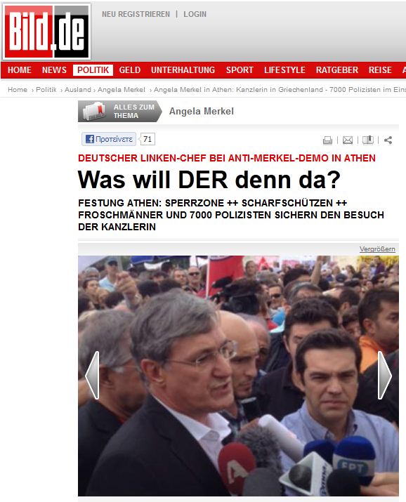 «Τι θέλει αυτός εκεί;» διερωτάται η γερμανική εφημερίδα Bild στον τίτλο δημοσιεύματος που αναφέρεται στην επίσκεψη του επικεφαλής της Αριστερής παράταξης της Γερμανίας (Die Linke), Bernd Riexinger, στην Αθήνα. Η Bild επικρίνει το γεγονός ότι ο Γερμανός πολιτικός κατέβηκε μαζί με τον πρόεδρο του ΣΥΡΙΖΑ, Αλέξη Τσίπρα, στο Σύνταγμα και βρέθηκε στο πλευρό των διαδηλωτών που διαμαρτύρονται για την επίσκεψη της καγκελάριου Angela Merkel στην Αθήνα. «Δεν μπορώ να καταλάβω την κριτική που δέχομαι για την παρουσία μου εδώ. Νιώθω πολύ δεμένος με την Ελλάδα. Και με αυτή μου την κίνηση θέλω να εκφράσω την αλληλεγγύη μου» απαντά ο Bernd Riexinger.