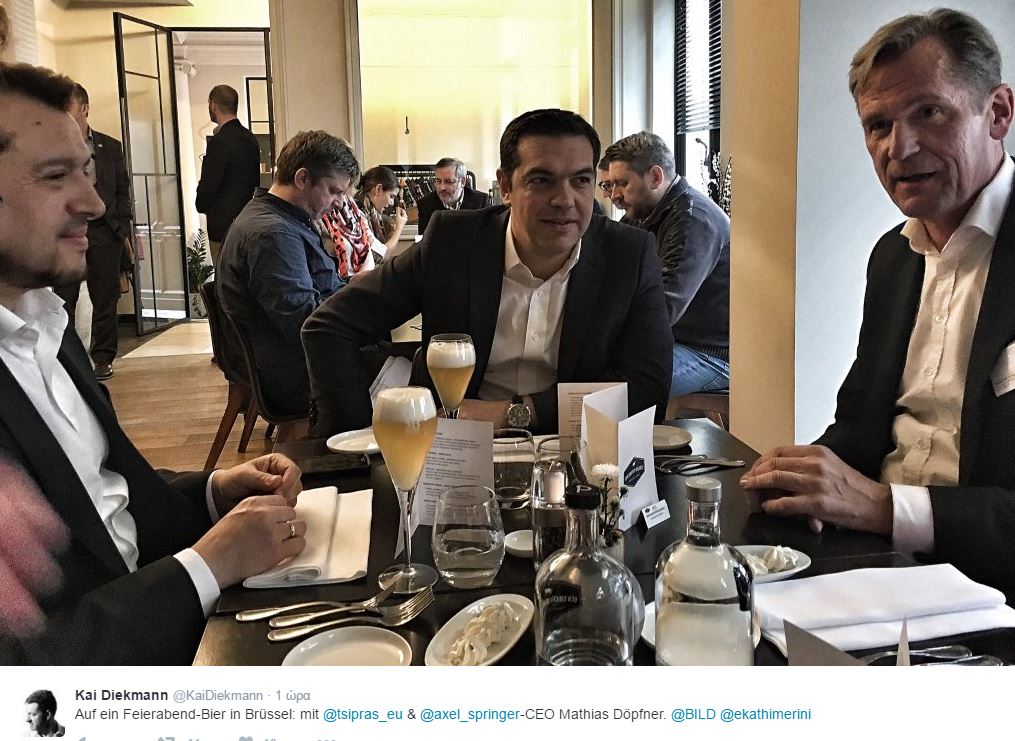 Ο κ. Τσίπρας, μαζί με τον υπουργό Επικρατείας, Νίκο Παππά ήπιαν μία μπύρα σε εστιατόριο των Βρυξελλών. Στην παρέα τους ήταν και ο «ισχυρός» άνδρας των γερμανικών media Mathias Döpfner. Πρόκειται για τον CEO του εκδοτικού οίκου «Axel Springer SE», ένα από τα μεγαλύτερα εκδοτικά συγκροτήματα στη Γερμανία.