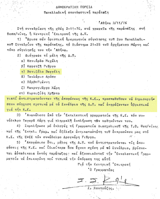 Το 1976 η σπουδαστική παράταξη «Δημοκρατική Πορεία» της Ένωσης Δημοκρατικού Κέντρου είχε διαγράψει το νεαρό φοιτητή, Εύαγγελο Βενιζέλο «γιατί αντιστρατευόταν τις δημοκρατικές αποφάσεις, δημιουργούσε σύγχυση και εκφραζόταν υβριστικά».