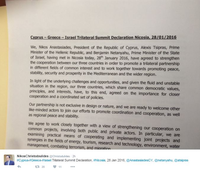 To κείμενο της διακήρυξης της Λευκωσίας που υπεγράφη μεταξύ Κύπρου – Ελλάδας – Ισραήλ ανέβασε στον λογαριασμό του στο twitter o Κυβερνητικός Εκπρόσωπος της Κύπρου, Νίκος Χριστοδουλίδης.