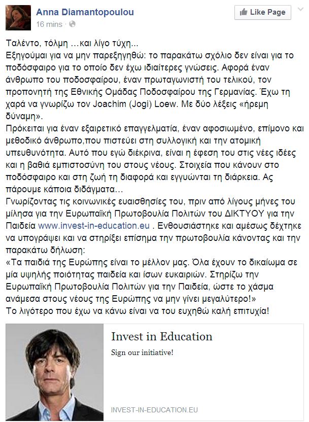 Με δύο λέξεις, η πρώην υπουργός του ΠΑΣΟΚ, Άννα Διαμαντοπούλου, περιγράφει τον Γερμανό προπονητή, Γιοακίμ Λεβ. «Ήρεμη δύναμη», έγραψε στο Facebook, εκφράζοντας τον θαυμασμό της για τον άνθρωπο που οδήγησε την Γερμανία στον τελικό του Μουντιάλ.