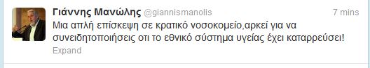 «Μια απλή επίσκεψη σε κρατικό νοσοκομείο, αρκεί για να συνειδητοποιήσεις ότι το εθνικό σύστημα υγείας έχει καταρρεύσει!», διαπιστώνει ο Γιάννης Μανώλης με σχόλιό του στο Twitter.