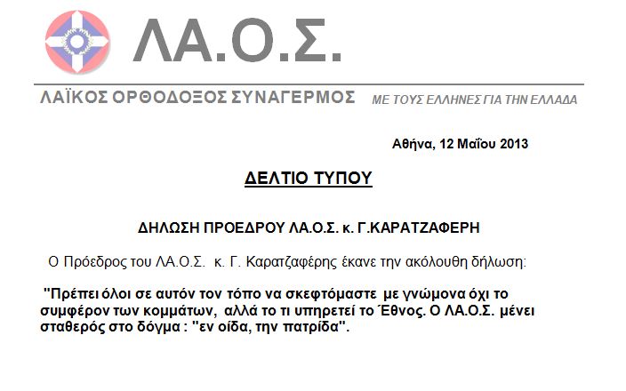 Πριν από λίγο ο πρόεδρος του ΛΑΟΣ Γιώργος Καρατζαφέρης προέβη στην ακόλουθη δήλωση: