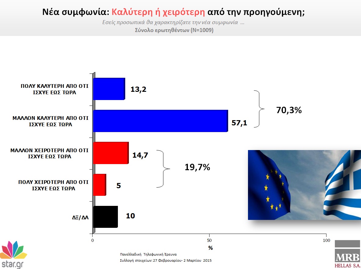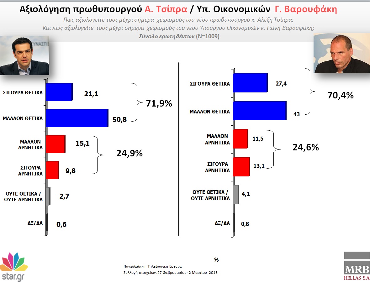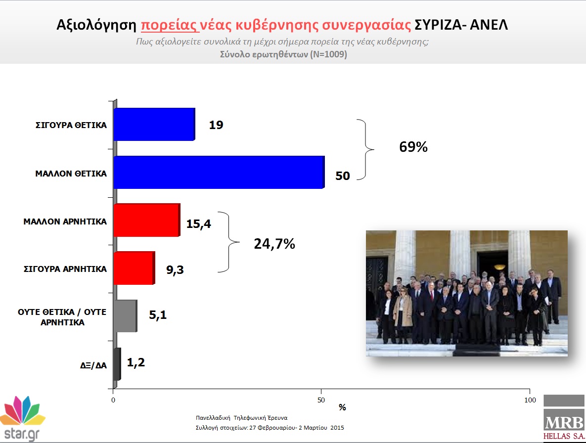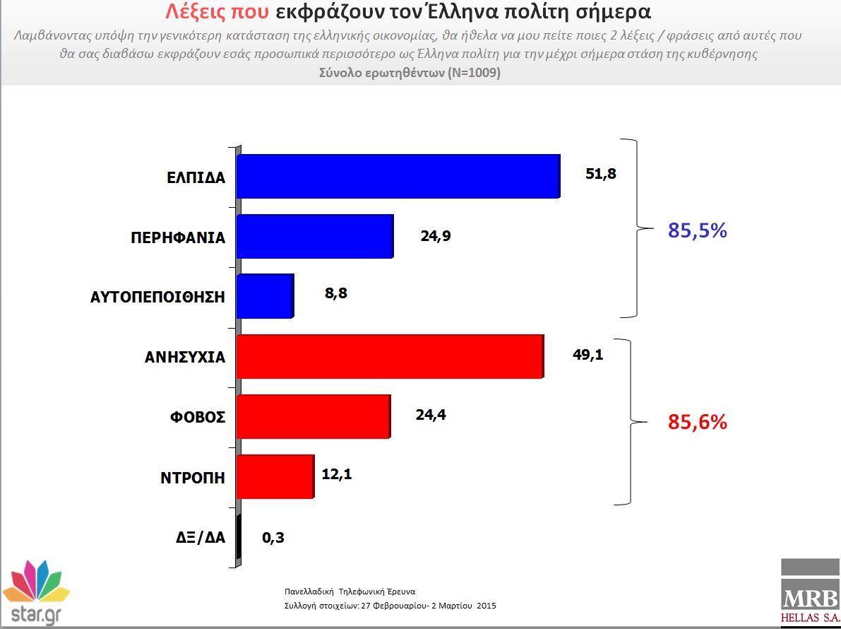 Στην ερώτηση «ποιες δύο λέξεις σας εκφράζουν προσωπικά περισσότερο ως Έλληνα για την μέχρι τώρα στάση της κυβέρνησης»: το 51, 8% απαντά ελπίδα, το 24,9% λέει περηφάνια και το 8,8% αισθάνεται αυτοπεποίθηση.Αντιθέτως, το 49,1% των ερωτηθέντων δηλώνει πως αισθάνεται ανησυχία, το 24,4% δηλώνει ότι φοβάται, ενώ 12 στους 100 Έλληνες λένε πως ντρέπονται για τη στάση της νέας κυβέρνησης. Υπάρχει και ένα 0,3% που αποφεύγει να απαντήσει.
