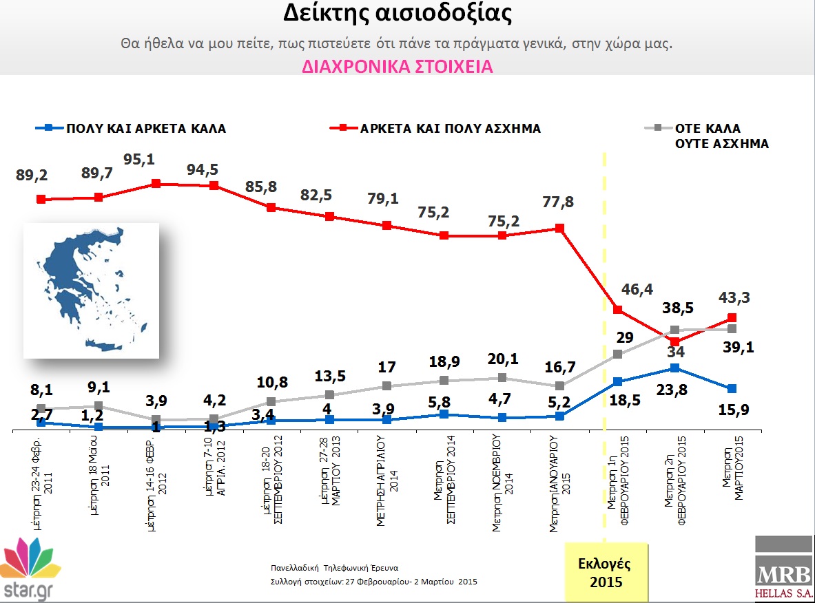 Στο ερώτημα «πως πιστεύετε ότι πάνε τα πράγματα γενικά στην χώρα μας», το 43,3% (περίπου 4 στους 10) εμφανίζεται αρκετά …απαισιόδοξο αν και έχουν περάσει μόλις 40 ημέρες από τις εκλογές της 25ης Ιανουαρίου. Αν και τις πρώτες ημέρες μετά τις εκλογές ολοένα και περισσότεροι Έλληνες, όπως φαίνεται και στην κάρτα που ακολουθεί, έβλεπαν τα πράγματα με ουδέτερη και θετική ματιά, μετά τις τελικές διαπραγματεύσεις και την συμφωνία για τετράμηνη παράταση του Eurogroup, το 43,3% των Ελλήνων βλέπει τα πράγματα άσχημα και μόνο το 15,9% ατενίζει αισιόδοξα το μέλλον της χώρας! Την ίδια ώρα, ένα 39,1% δηλώνει ότι τα πράγματα δεν είναι “ούτε καλά, ούτε άσχημα”.