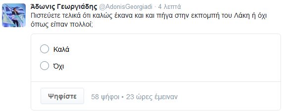 Η ερώτηση-δημοψήφισμα του Άδωνι Γεωργιάδη αναφέρει συγκεκριμένα: «Πιστεύετε τελικά ότι καλώς έκανα και πήγα στην εκπομπή του Λάκη ή όχι όπως είπαν πολλοί»;