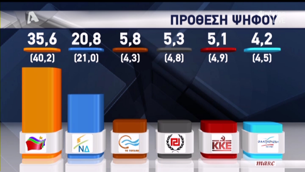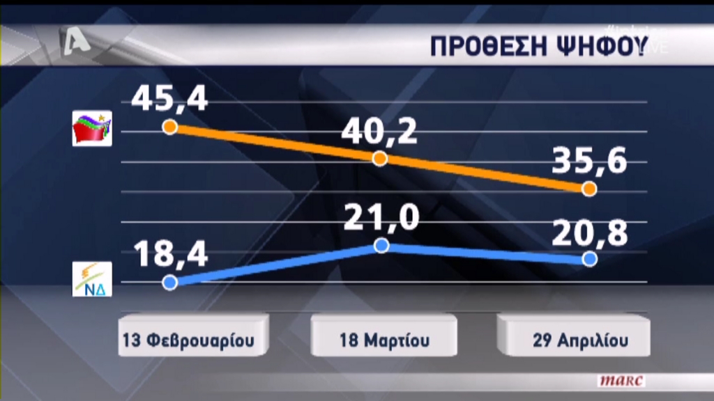 Προβάδισμα 14,8% του ΣΥΡΙΖΑ έναντι της Νέας Δημοκρατίας δίνει η δημοσκόπηση της Marc για λογαριασμό του ALPHA.