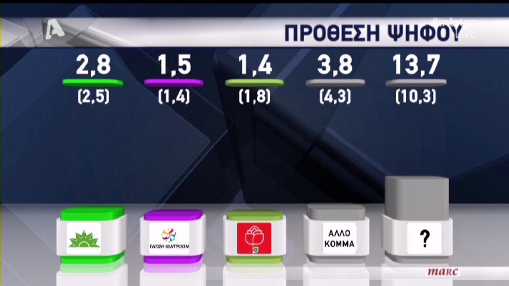 Συγκεκριμένα, στην πρόθεση ψήφου ο ΣΥΡΙΖΑ συγκεντρώνει το 35,6% και η Νέα Δημοκρατία το 20,8%. Ακολουθούν το Ποτάμι με 5,8%, η Χρυσή Αυγή με 5,3%, το ΚΚΕ με 5,1%, οι Ανεξάρτητοι Έλληνες με 4,2% και το ΠΑΣΟΚ με 2,8%. Η αδιευκρίνιστη ψήφος ανέρχεται σε 13,7%.
