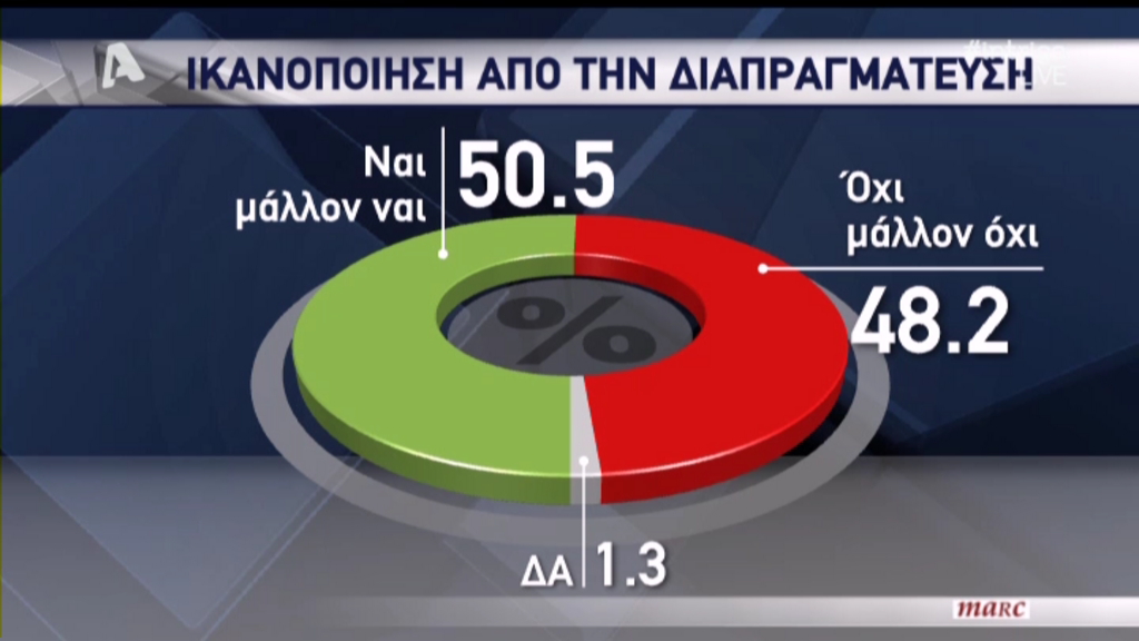 Το 50,5% σύμφωνα με τη δημοσκόπηση της Marc, φαίνεται να είναι ικανοποιημένο από την διαπραγμάτευση της κυβέρνησης με τους εταίρους, ενώ το 48,2% φαίνεται να μην είναι ικανοποιημένο.