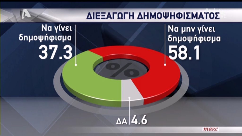 Στο ερώτημα αν πρέπει να γίνει δημοψήφισμα το 58,1% δεν θέλει να γίνει δημοψήφισμα και το 37,3% επιθυμεί τη διεξαγωγή δημοψηφίσματος.