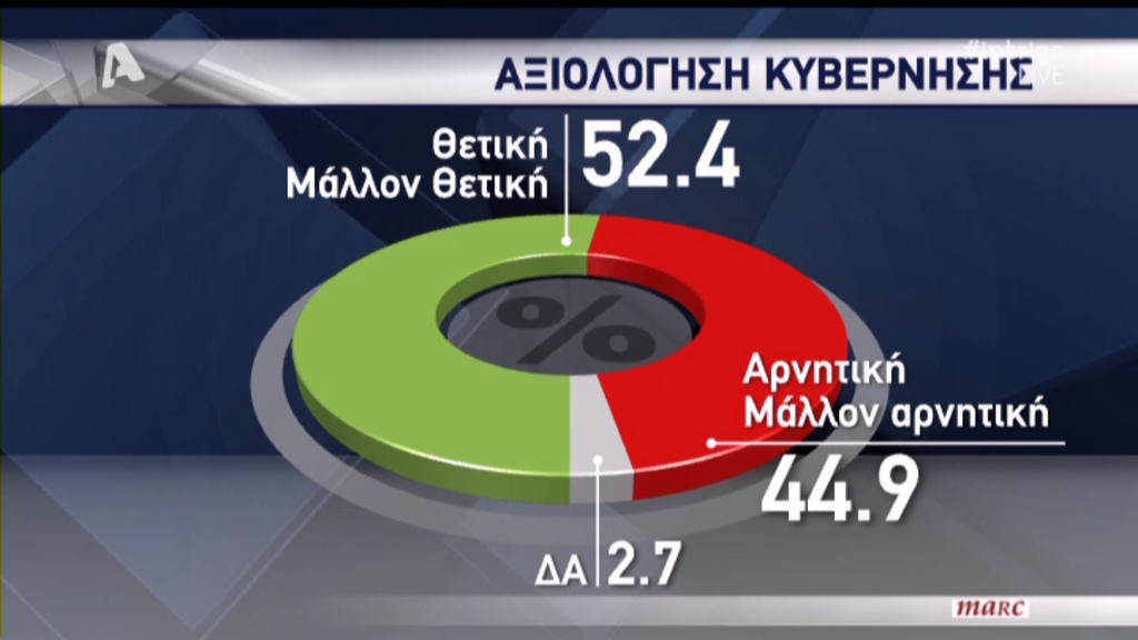 Σε ότι αφορά την αξιολόγηση της κυβέρνησης, το 52,4% αξιολογεί θετικά την κυβέρνηση, ενώ αντίθετα το 44,9% την αξιολογεί αρνητικά.