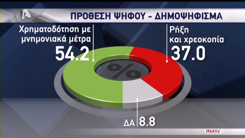 Σχετικά με την πρόθεση ψήφου σε περίπτωση που διεξαχθεί δημοψήφισμα το 54,2% επιθυμεί χρηματοδότηση έστω και με μνημονιακά μέτρα ενώ το 37% επιθυμεί ρήξη και χρεοκοπία.