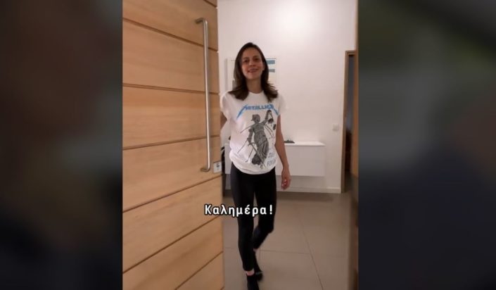 Την βλέπουμε στην κουζίνα του σπιτιού να ετοιμάζει πρωινό με αβοκάντο για τον μικρό Άρη. Στη συνέχεια βλέπουμε τον μπαμπά του μικρού, επίσης βουλευτή της Νέας Αριστεράς, Δημήτρη Τζανακόπουλο να τον παίρνει από το χέρι για να τον πάει στο σχολείο.