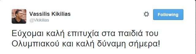 Για τη μάχη που θα δώσει σήμερα ο Ολυμπιακός απέναντι στην ΤΣΣΚΑ Μόσχας στην Μαδρίτη, εν όψει του ημιτελικού του Final 4 της Ευρωλίγκας, ο βουλευτής της Νέας Δημοκρατίας και πρώην παίκτης του μπάσκετ, Βασίλης Κικίλιας, μέσα από τον προσωπικό του λογαριασμό στο Twitter, έστειλε την ευχή του στους παίκτες, γράφοντας: «Εύχομαι καλή επιτυχία στα παιδιά του Ολυμπιακού και καλή δύναμη σήμερα!».