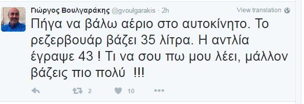 “Πήγα να βάλω αέριο στο αυτοκίνητο. Το ρεζερβουάρ βάζει 35 λίτρα. Η αντλία έγραψε 43 ! Τι να σου πω μου λέει, μάλλον βάζεις πιο πολύ !!!” σχολίασε στο twitter αποκαλύπτοντας το περιστατικό.