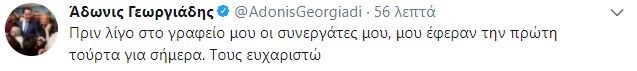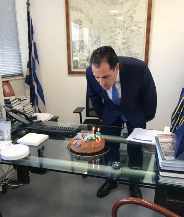 Τα γενέθλιά του έχει σήμερα ο Αντιπρόεδρος της ΝΔ, Άδωνις Γεωργιάδης και όπως έγραψε ο ίδιος στον λογαριασμό του στο twitter, οι συνεργάτες του, έφεραν στο γραφείο την πρώτη τούρτα για σήμερα.
