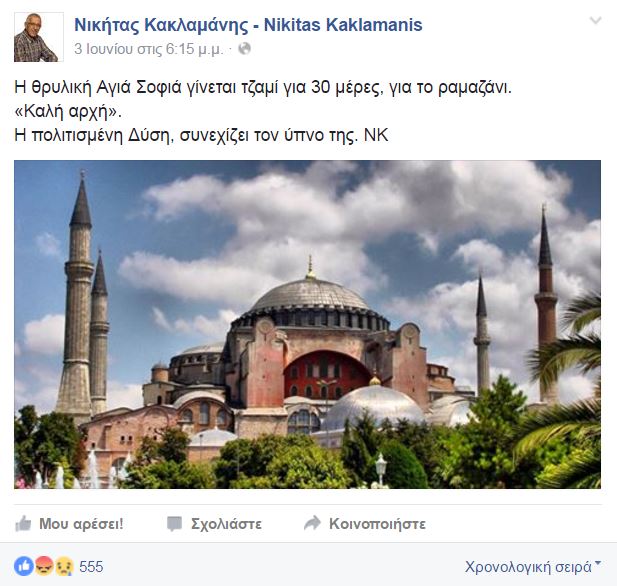 Ο κ. Κακλαμάνης, έχει ανεβάσει και μία φωτογραφία με την Αγιά Σοφιά που έχει συγκεντρώσει συνολικά 555 “likes”, 85 κοινοποιήσεις και πολλά σχόλια.