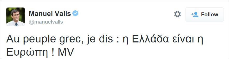 «Η Ελλάδα είναι η Ευρώπη» έγραψε στα ελληνικά ο Πρωθυπουργός της Γαλλίας, Μανουέλ Βαλς, στον προσωπικό του λογαριασμό στο twitter.