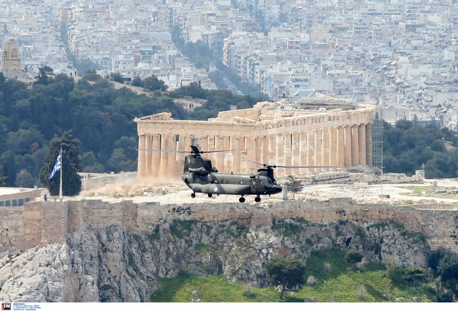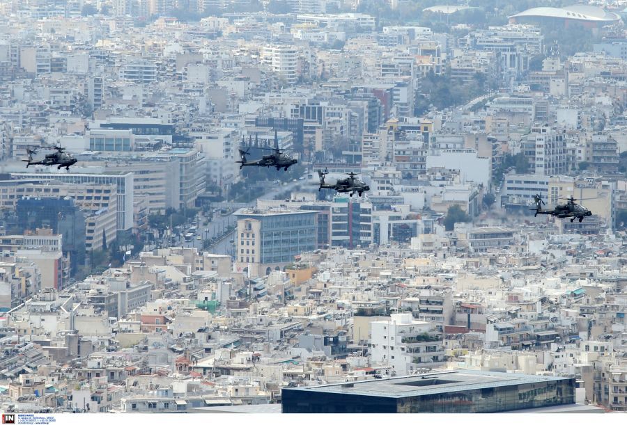 Τον ουρανό της Αθήνας γέμισαν ελικόπτερα ΑΗ-64 APACHE 1, OH-58D KIOWA WARRIOR, UH-1H, NH90 και CH-47D CHINOOK, κατά την μεγάλη στρατιωτική παρέλαση για την 25η Μαρτίου 1821.