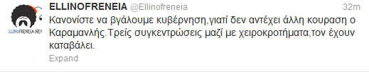 Με τον πρώην πρωθυπουργό Κώστα Καραμανλή τα “βάζει” η ελληνοφρένεια, σχολιάζοντας στο Twitter τις επικείμενες εκλογές.”Κανονίστε να βγάλουμε κυβέρνηση,γιατί δεν αντέχει άλλη κούραση ο Καραμανλής.Τρεις συγκεντρώσεις μαζί με χειροκροτήματα,τον έχουν καταβάλει”, γράφει η ελληνοφρένεια.