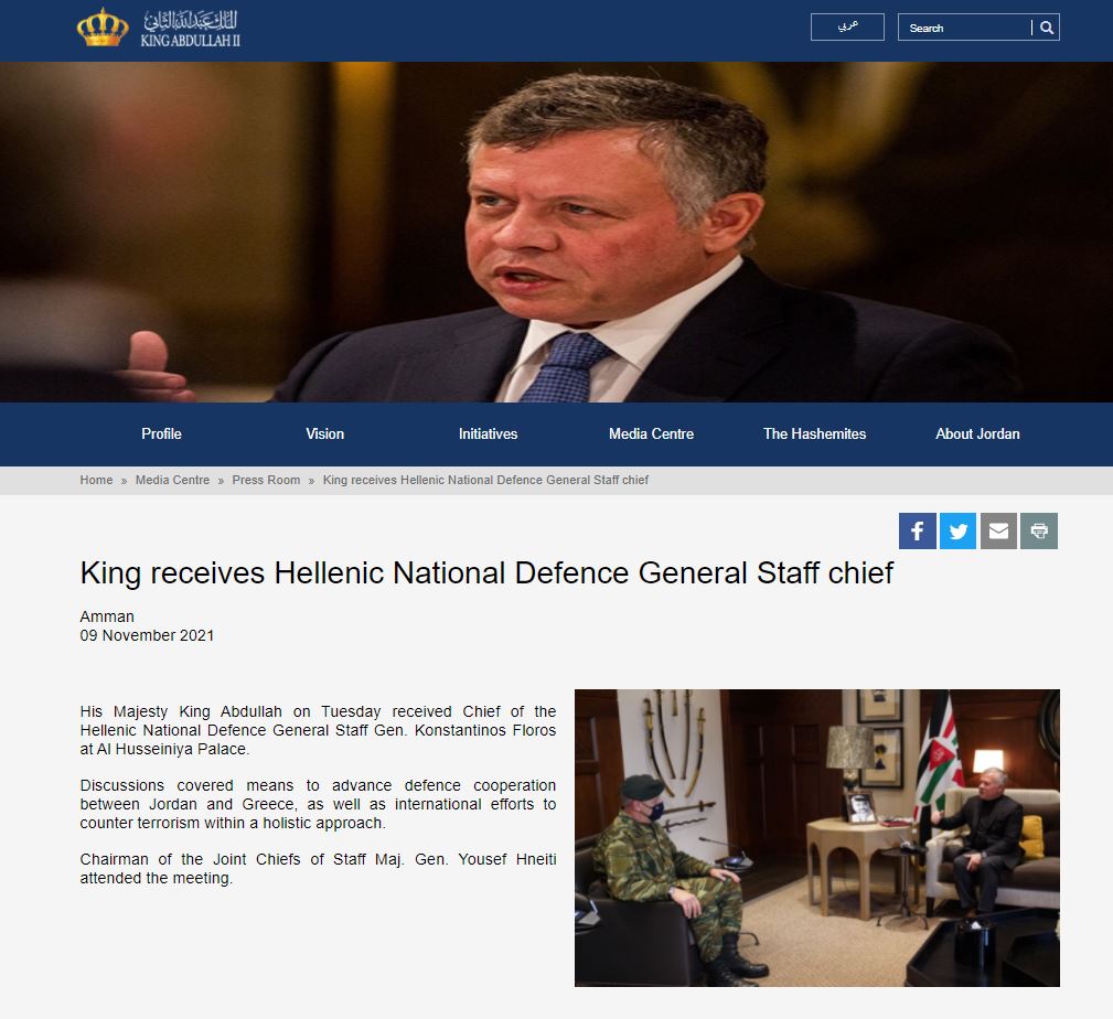 Χαρακτηριστική είναι η ανακοίνωση που εξέδωσε το Παλάτι της Ιορδανίας, η πρώτη φορά που το κάνει για Έλληνα Αρχηγός ΓΕΕΘΑ, επισημαίνοντας: «Οι συζητήσεις κάλυψαν τα μέσα για την προώθηση της αμυντικής συνεργασίας μεταξύ της Ιορδανίας και της Ελλάδας, καθώς και τις διεθνείς προσπάθειες για την αντιμετώπιση της τρομοκρατίας στο πλαίσιο μιας ολιστικής προσέγγισης».