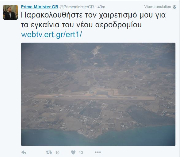 Μια φωτογραφία της Πάρου τραβηγμένη μέσα από το αεροπλάνο, λίγο πριν από την προσγείωση στο νέο αεροδρόμιο του νησιού, ανέβασε στο λογαριασμό του στο twitter, ο Πρωθυπουργός.