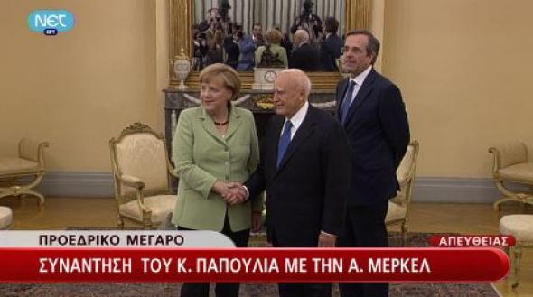 Δείτε το βίντεο με την άφιξη, αλλά και την τελετή υποδοχής της Angela Merkel από τον Αντώνη Σαμαρά.   Η κα Merkel μετέβη υπό δρακόντεια μέτρα ασφαλείας στο Μέγαρο Μαξίμου, συνοδευόμενη από τον κ. Σαμαρά. Συμβολικό είναι το γεγονός ότι οι δύο ηγέτες δεν μπήκαν κατευθείαν στο Μέγαρο, αλλά είχαν στο κατώφλι του Μεγάρου Μαξίμου, μπροστά σε δεκάδες δημοσιογράφους, έναν διάλογο που διήρκησε αρκετά λεπτά.   Η Merkel ”θαυμάζει” το γραφείο του Πρωθυπουργού Η Angela Merkel ρώτησε για την γύρω περιοχή , ενώ ο Αντώνης Σαμαράς της είπε “εδώ είναι το γραφείο μου, δίπλα το Προεδρικό Μέγαρο” και κάποια στιγμή της έδειξε και τον Εθνικό Κήπο.Σαμαράς και Μerkel είχαν ένα σύντομο διάλογο και μέσα στο Πρωθυπουργικό γραφείο πριν ξεκινήσει η συνάντηση.”Εδώ είναι το πρωθυπουργικό γραφείο. Εδώ ήταν και γραφείο του προκατόχου μου, του κ. Καραμανλή”, είπε στην Angela Merkel.”Εδώ συνεδριάζει και  το υπουργικό συμβούλιο;” ρώτησε γερμανίδα καγκελάριος.”Όχι, το υπουργικό συμβούλιο συνεδριάζει λίγο πιο κάτω στη βουλή”, απάντησε ο Πρωθυπουργός.    Οι δηλώσεις Σαμαρά- Merkel   «Βλέπω φως στο βάθος του τούνελ» δήλωσε η Γερμανίδα Καγκελάριος Angela Merkel μετά την συνάντηση που είχε με τον πρωθυπουργό κ. Αντώνη Σαμαρά στο Μέγαρο Μαξίμου και πρόσθεσε: «Ελπίζω και εύχομαι η Ελλάδα να παραμείνει στην Ευρωζώνη».Σημείωσε πάντως ότι οι προϋποθέσεις για την παραμονή στην ευρωζώνη προκύπτουν μέσα από την αξιολόγηση της Τρόικας και συνέχισε λέγοντας ότι “πιέζουμε και οφείλουμε να λύσουμε το πρόβλημα. Σε ερώτηση για τον χρόνο εκταμίευσης της δόσης απάντησε ότι «το να δουλεύει κανείς σε βάθος είναι πιο σημαντικό από το να είναι γρήγορος. Πιέζουμε τα πράγματα αλλά θα πρέπει να ανακτηθεί η αξιοπιστία».Η Merkel χαρακτήρισε την χρονική περίοδο που βιώνει η Ελλάδα είναι ιδιαίτερα δύσκολη, κυρίως για τους ανθρώπους της, καθώς όπως είπε ζητούνται πάρα πολλά. «Έχει ολοκληρωθεί ένα μεγάλο κομμάτι του δρόμου και παρά το γεγονός ότι η πορεία είναι δύσκολη αξίζει να την ολοκληρώσει η Ελλάδα. Κοινό μας συμφέρον είναι να ανακτήσουμε την αξιοπιστία μας στην Ευρώπη και να δείξουμε ότι μπορούμε να επιλύσουμε τα προβλήματά μας».Η κα. Merkel αναφέρθηκε και για την ανάγκη της ανάπτυξης: «Παράλληλα με τα μέτρα λιτότητας θα πρέπει να υπάρξει ανάπτυξη, θα στηρίξουμε ότι είναι αναγκαίο για να πάρει η Ελλάδα χρήματα από την Ευρωπαϊκή Τράπεζα Επενδύσεων». Υπάρχει σημαντική πρόοδος στην Ελλάδα δήλωσε η καγκελάριος και πρόσθεσε: «Δεν έχουν επιτευχθεί όλα αλλά έχουν γίνει σημαντικά βήματα. Η έκθεση της Τρόικας θα δοθεί στις επόμενες ημέρες, πιέζουμε κι εμείς, οφείλουμε να λύσουμε τα προβλήματα. Η αξιοπιστία ανακτάται μόνο μέσω της επίλυσης των προβλημάτων».Από την πλευρά του ο πρωθυπουργός Αντώνης Σαμαράς, δήλωσε ότι «η Ελλάδα θα τηρήσει τις υποχρεώσεις της και θα ξεπεράσει την κρίση. Προϋπόθεση είναι να βγούμε από την ύφεση και την ανεργία. Αυτό προϋποθέτει ότι η Ελλάδα θα παραμείνει στο ευρώ και θα εφαρμόσει τις διαρθρωτικές αλλαγές».«Ο ελληνικός λαός ματώνει αλλά έχει αποφασίσει να παραμείνει στο ευρώ και να κερδίσει το στοίχημα. Δεν ζητάμε χρήματα ή χάρη αλλά την ευκαιρία να σταθούμε στα πόδια μας», είπε ο Αντώνης Σαμαράς και πρόσθεσε: «Η κα Merkel έδειξε απόλυτη κατανόηση και σεβασμό και τόνισε ότι οι θυσίες δεν θα πάνε χαμένες. Η αξιοπιστία μας έχει αυξηθεί και η επίσκεψη της κ. Merkel στην Αθήνα το αποδεικνύει»Επίσης, ο πρωθυπουργός 