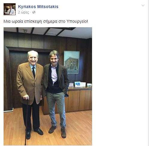 “Μια ωραία επίσκεψη σήμερα στο υπουργείο” σχολίασε ο Κυριάκος Μητσοτάκης ανεβάζοντας μια φωτογραφία στο facebook με τον πατέρα του Κωνσταντίνο Μητσοτάκη.