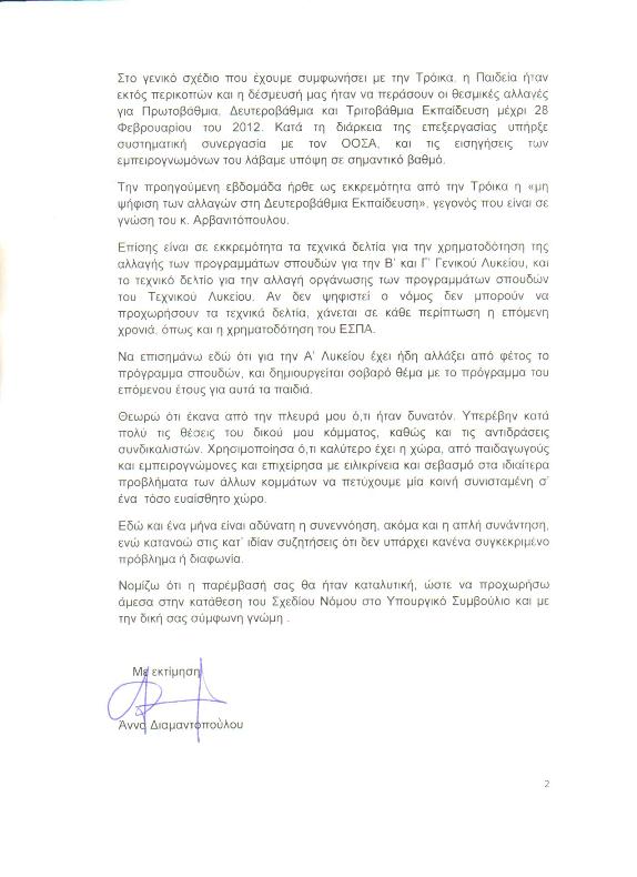 Διαβάστε την επιστολή της ‘Αννας Διαμαντοπούλου προς τον Αντώνη Σαμαρά, τον Μάρτιο του 2012.